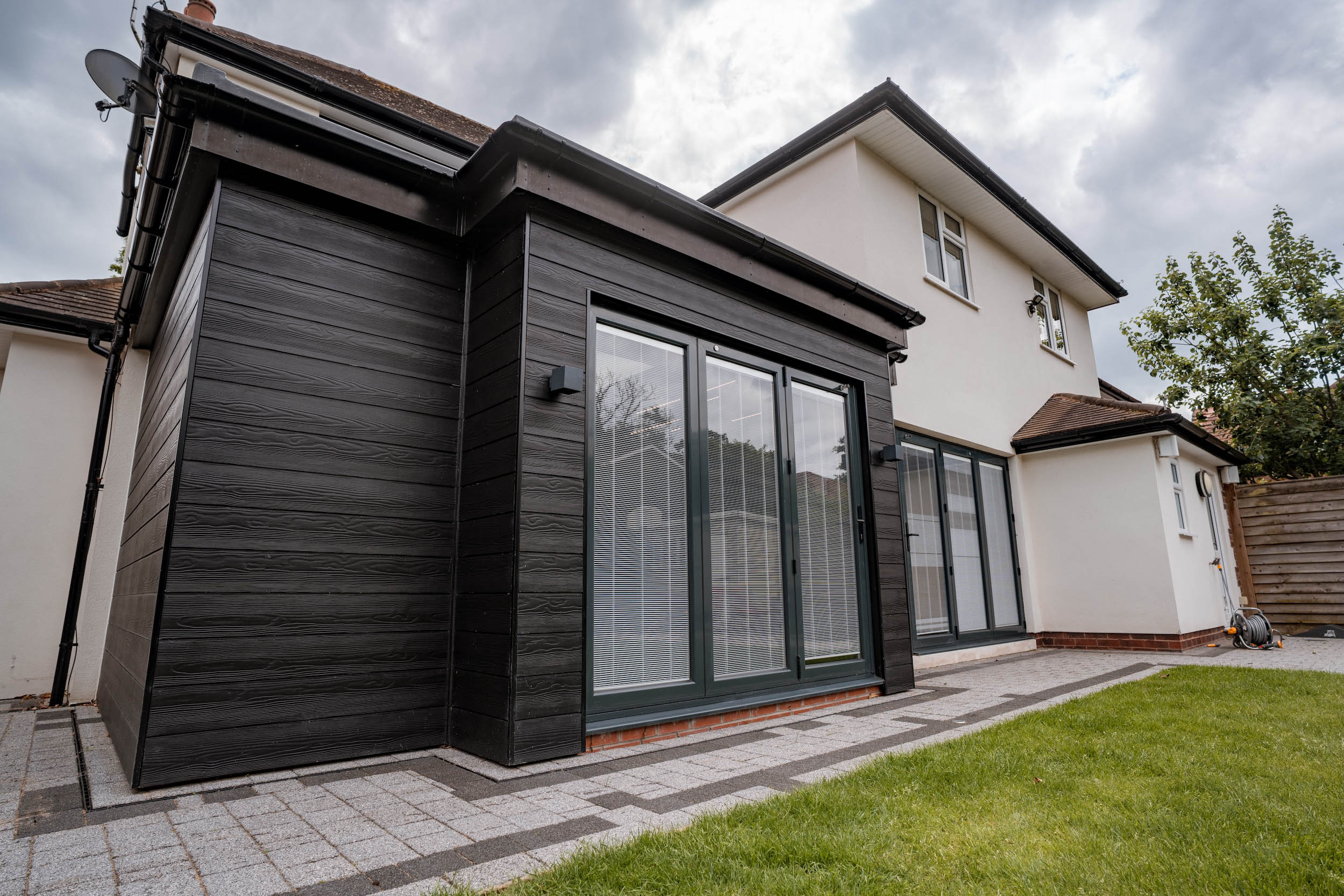 This Handforth project features a stylish single-storey rear extension designed to create a warm and versatile snug space filled with natural light. Large bifold doors open directly onto the garden, strengthening the connection between indoor and outdoor living, while modern grained finish cladding adds texture, character and a contemporary, low-maintenance finish that enhances the home’s overall aesthetic.