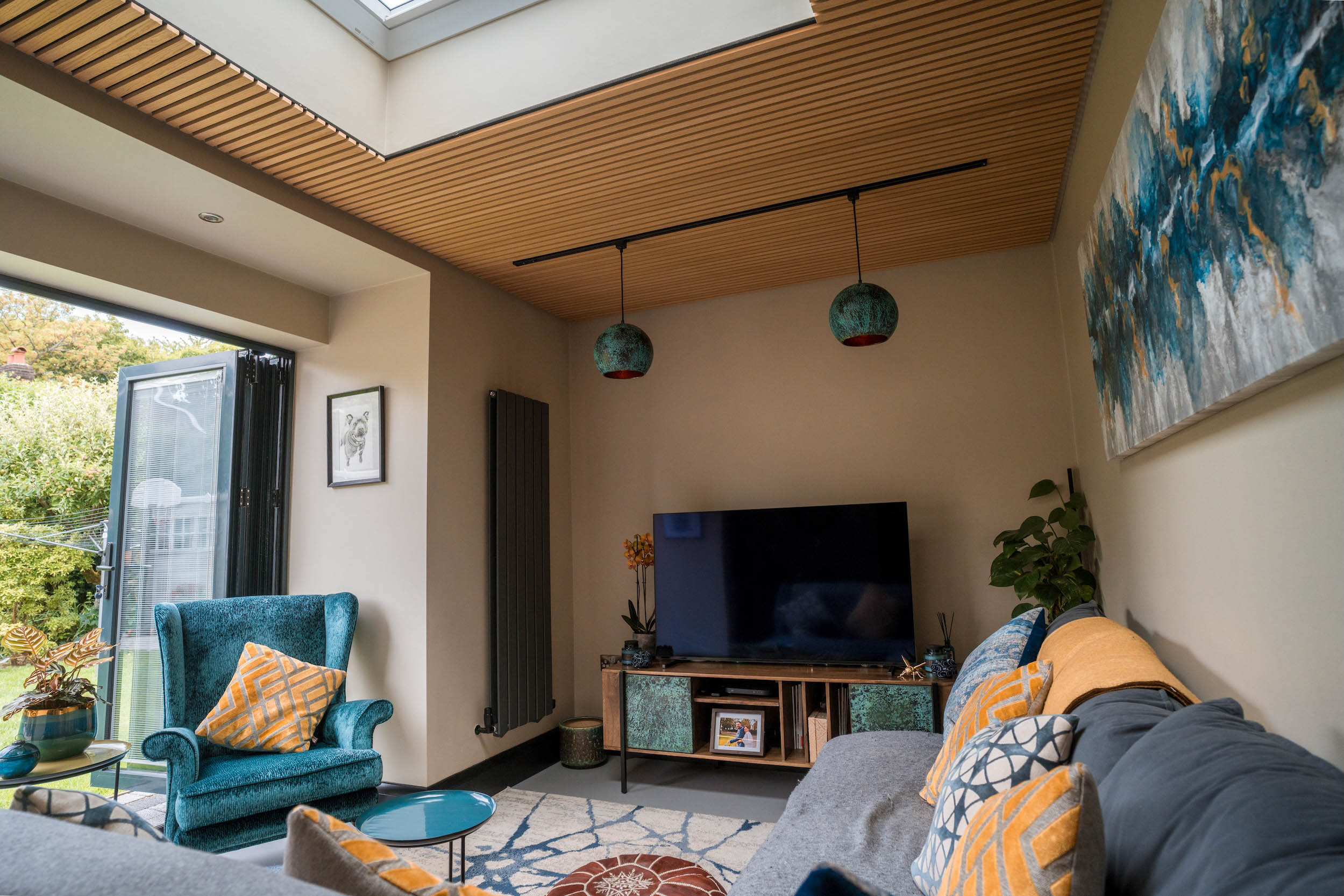Bifold doors open the space to the garden, allowing light to flood in and encouraging seamless outdoor living.